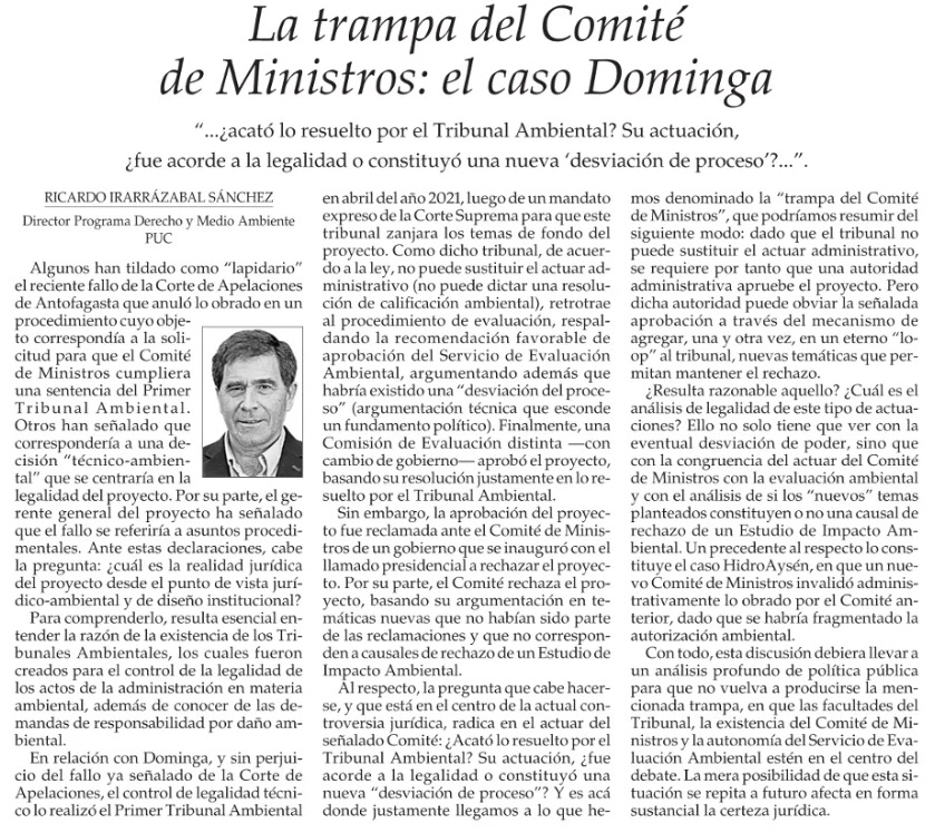 Nuestro director y académico de Derecho UC, Ricardo Irarrábal, publicó en el Diario El Mercurio la columna titulada "La trampa del Comité de Ministros: el caso Dominga".